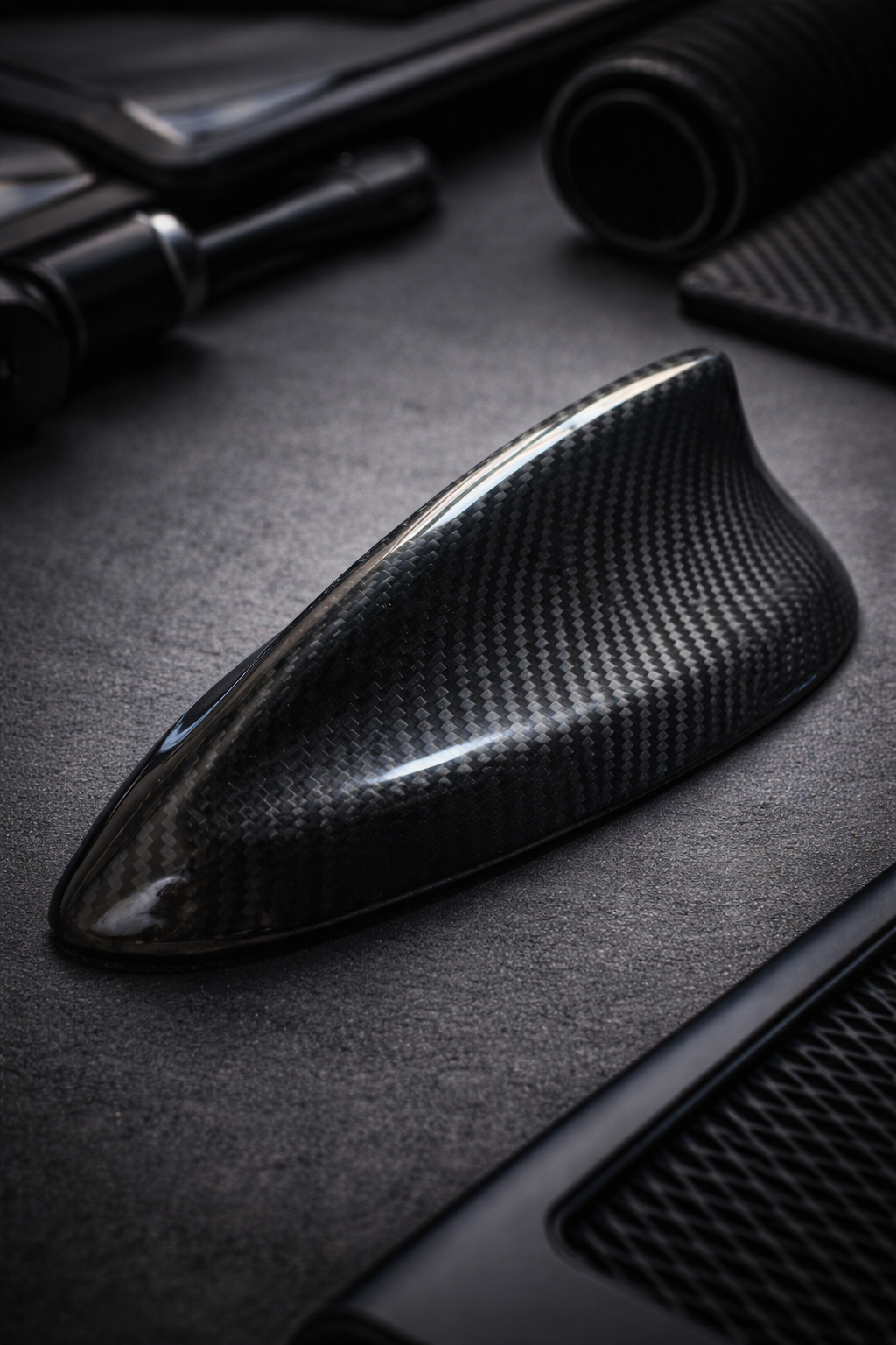 Cubierta de antena en carbono seco real para BMW. Diseño tipo aleta de tiburón con acabado premium, ligera y resistente, que aporta un look deportivo y exclusivo sin alterar la señal original. El detalle perfecto para elevar la estética de tu BMW.